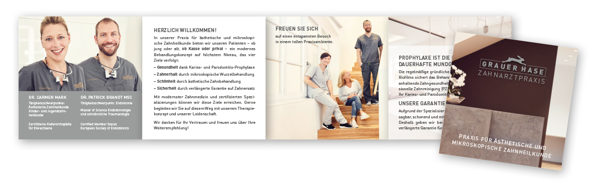 Ein junges Zahnärztepaar lässt sich nieder – in ihrer Heimatstadt. Und das in einem bekannten Gebäude mit Geschichte: Das ehemalige Feinschmeckerrestaurant „Grauer Hase“ wurde u.a. zu einer top-modernen Zahnarztpraxis umgebaut. Wir haben das Marketingkonzept entwickelt und umgesetzt. Gold und grau: Das Corporate Design für die Praxisausstattung wirkt edel, modern und spiegelt die hohe Praxisqualität wider.