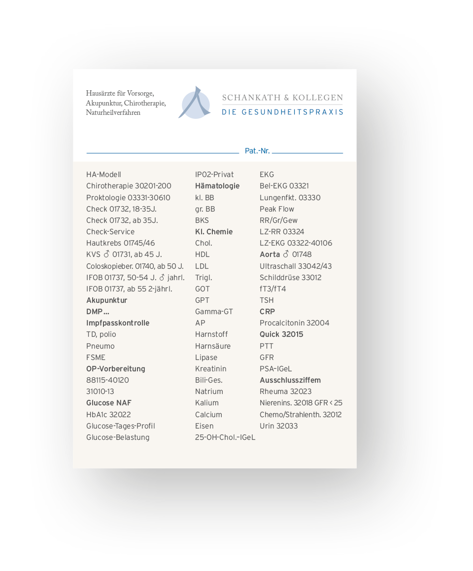 Die Hausarztpraxis von Dr. Petra Schankath positionierten wir mit neuer Website im Internet. Schwerpunkte sind Vorsorge und Früherkennung, damit Krankheiten sich erst gar nicht etablieren und chronisch werden. In der für alle Patienten offen stehenden Praxis widmet das erfahrene Ärztepaar seinen Patienten viel Zeit und bietet ein ganzheitliches Diagnostik- und Therapieangebot.