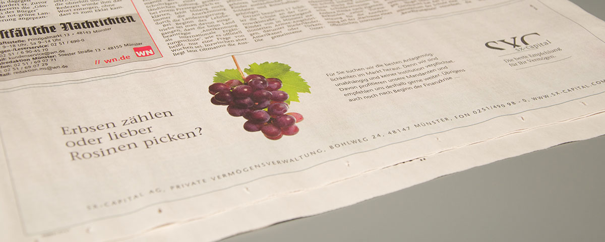 „Wenn’s um Geld geht …“, nein! nicht Sparkasse, sondern die Vermögensberater von SX-CAPITAL. Mit einer Anzeigenserie als Imagekampagne kommunizierten wir die Vorzüge einer individuellen Vermögensberatung durch Experten.
