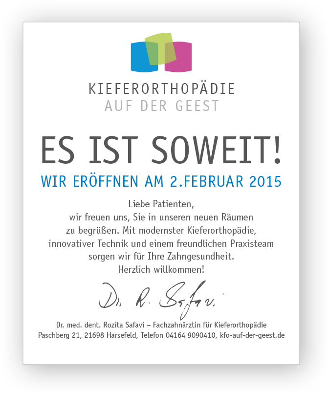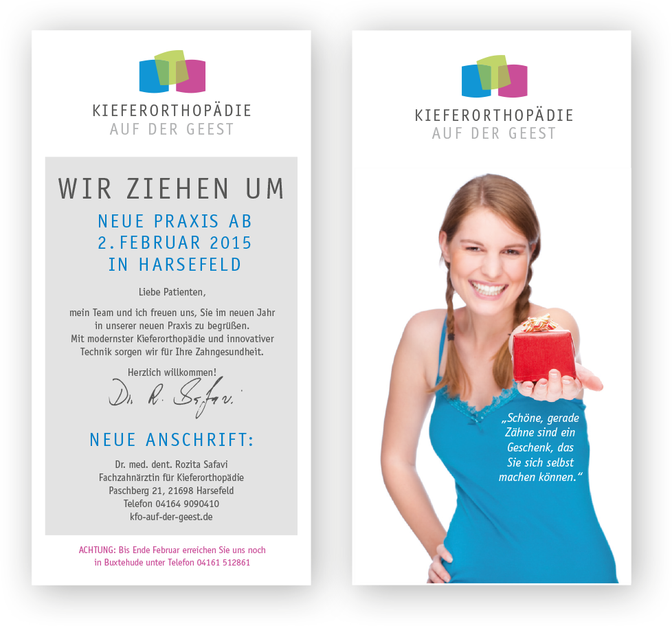 Als Dr. Safavi ihre Praxis von Buxtehude nach Harsefeld verlegte, erhielten wir den Auftrag, die Neueröffnung werblich zu begleiten. Das neue Corporate Design und die neue Website waren das sichtbare Ergebnis. Die Praxisverlegung wurde ein Erfolg.