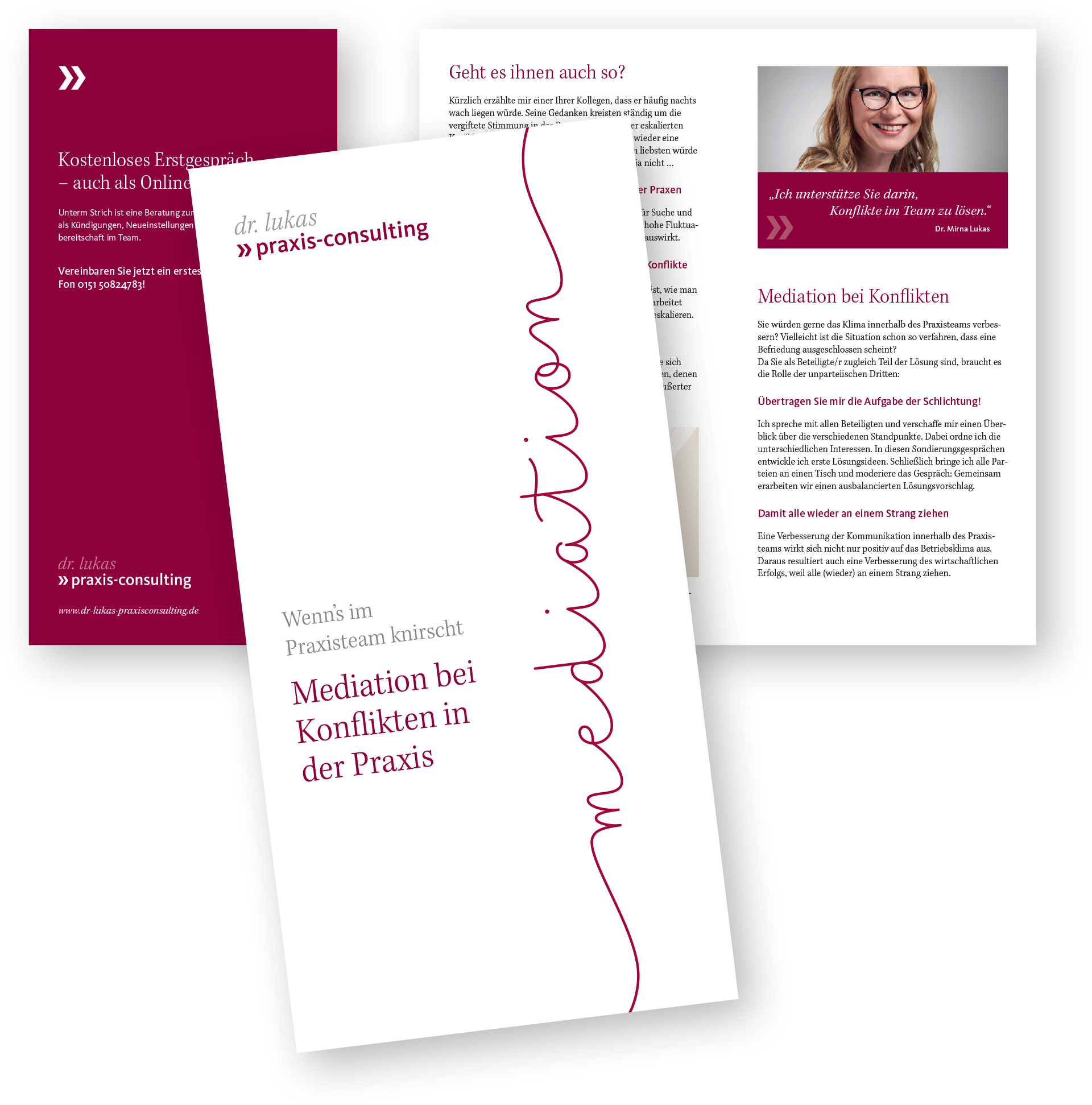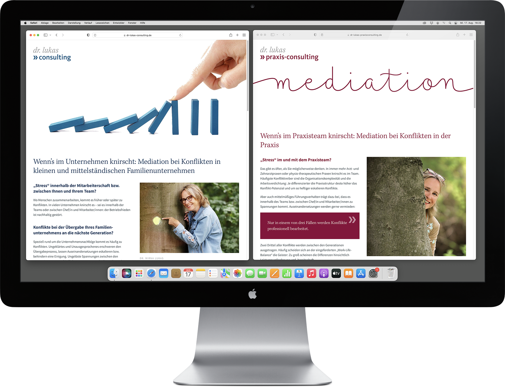 Ein Thema, das vielen Unternehmer*innen den Schlaf raubt: Konfliktbewältigung innerhalb der Familie oder des Teams. Ob Nachfolgeregelung in klein- und mittelständischen Familienunternehmen oder Lösung von Teamkonflikten in (Zahn-)Arztpraxen: Dr. Mirna Lukas bietet Lösungen durch Mediation in diesen und ähnlichen Fällen. Wir entwickelten für Dr. Lukas Consulting und Dr. Lukas Praxis-Consulting einen markanten Marktauftritt.