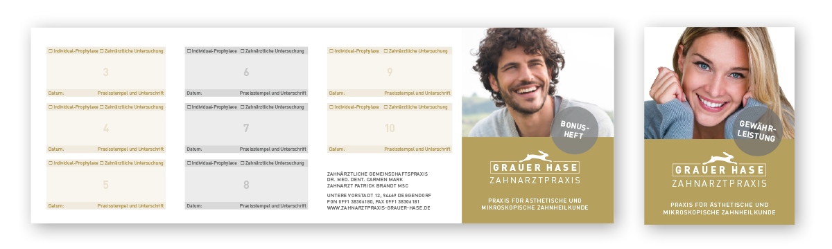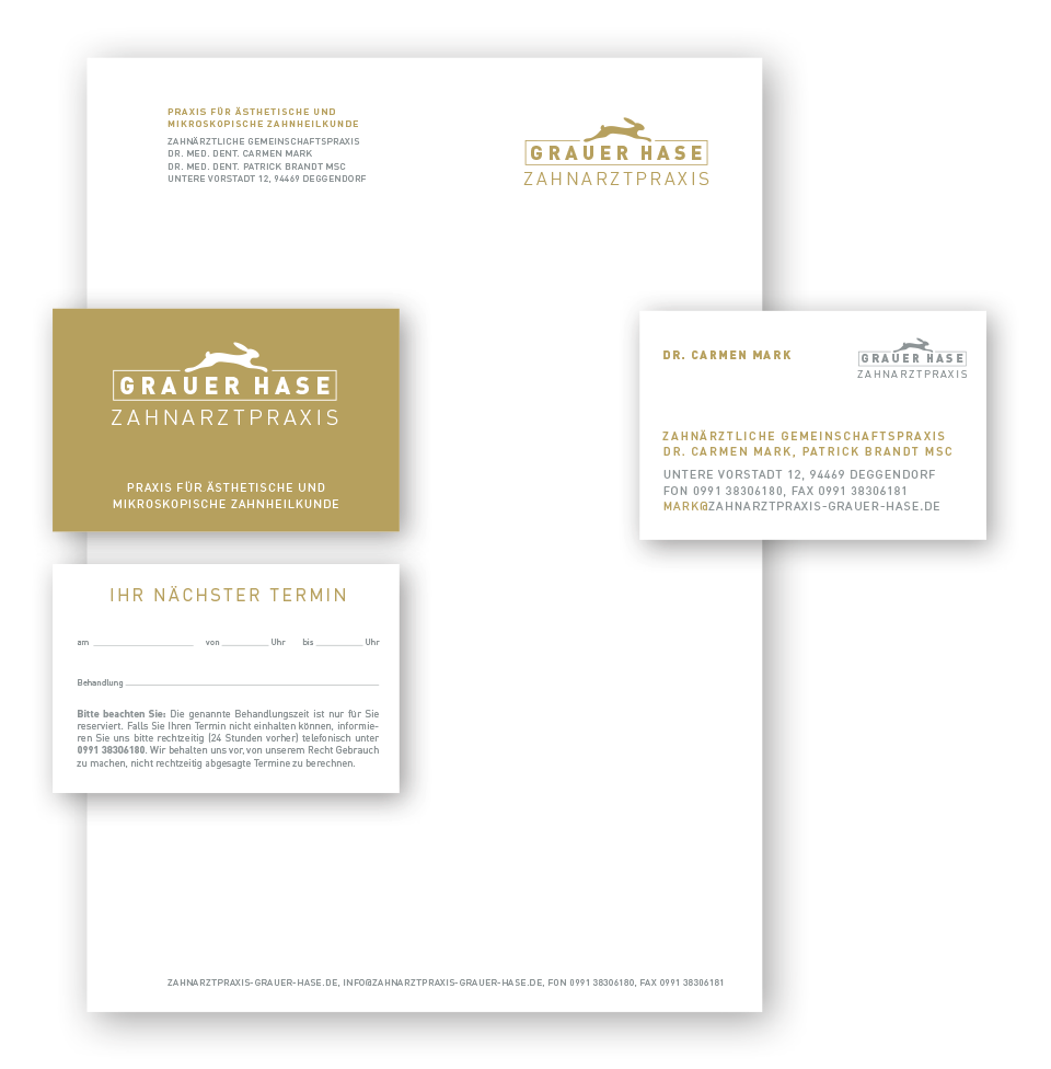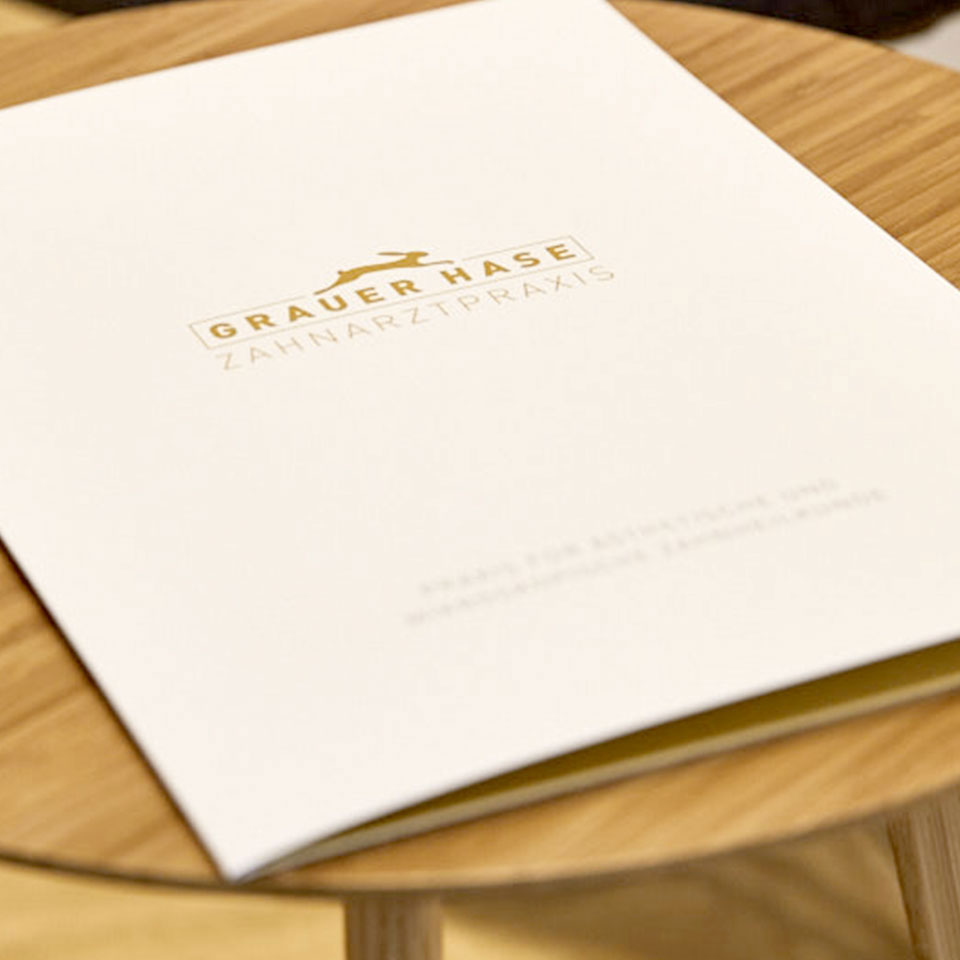 Ein junges Zahnärztepaar lässt sich nieder – in ihrer Heimatstadt. Und das in einem bekannten Gebäude mit Geschichte: Das ehemalige Feinschmeckerrestaurant „Grauer Hase“ wurde u.a. zu einer top-modernen Zahnarztpraxis umgebaut. Wir haben das Marketingkonzept entwickelt und umgesetzt. Gold und grau: Das Corporate Design für die Praxisausstattung wirkt edel, modern und spiegelt die hohe Praxisqualität wider.