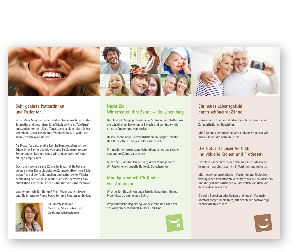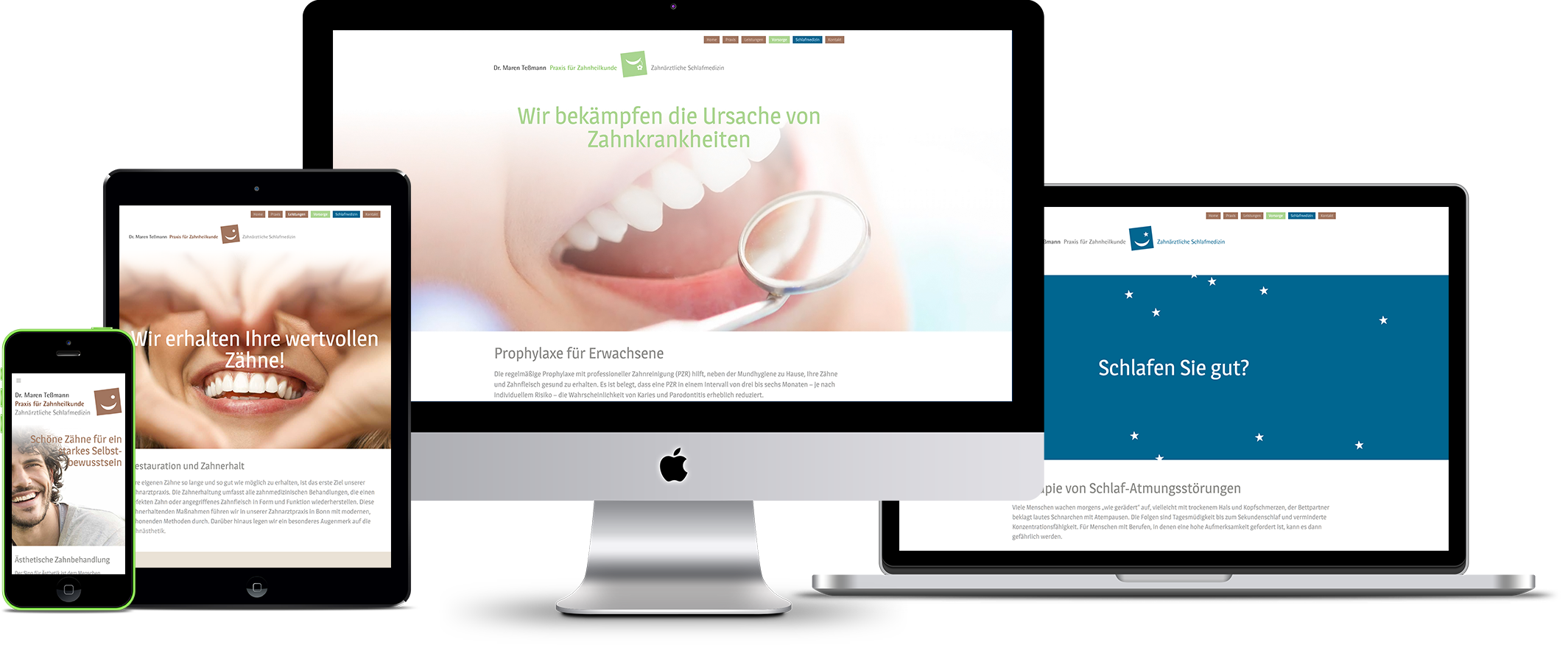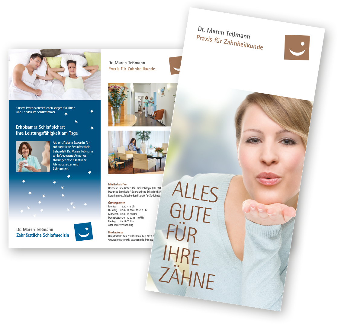 In Bonn herrscht ein besonders starker Wettbewerb. Deshalb beauftragte uns Dr. Maren Teßmann damit, Ihre Praxiskommunikation zu schärfen. Eine besondere Expertise besitzt sie im Bereich der zahnärztlichen Schlafmedizin, die wir — neben der Prophylaxe — als „Profitcenter“ auf der Webseite herausstellten. Die Bereiche Zahnerhaltung, Prophylaxe und Schlafmedizin wurden mit einem Logokonzept strukturiert und …!?